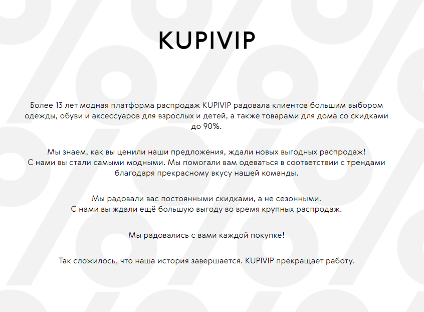 Интернет-магазин KupiVIP, основанный в 2008 г., прекратил работу. Об этомговорится на сайте маркетплейса. Иных объяснений, кроме «Так сложилось,что наша история завершается», компания не дает. О закрытии объявил ионлайн-магазин Mamsy, также принадлежащий группе Private Trade.