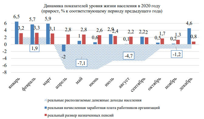 Кризис 2020 г. оказался нетипичным с точки зрения показателей, которыехарактеризуют уровень жизни населения. Странность заключалась в том, чтореальные начисленные заработные платы и пенсии россиян росли, а доходы отпредпринимательской деятельности и прочих денежных поступлений снижались —такая динамика не характерна для кризисного периода. Все это привело ксокращению реальных располагаемых денежных доходов на 2,8%, говорится взаключении Счетной палаты.