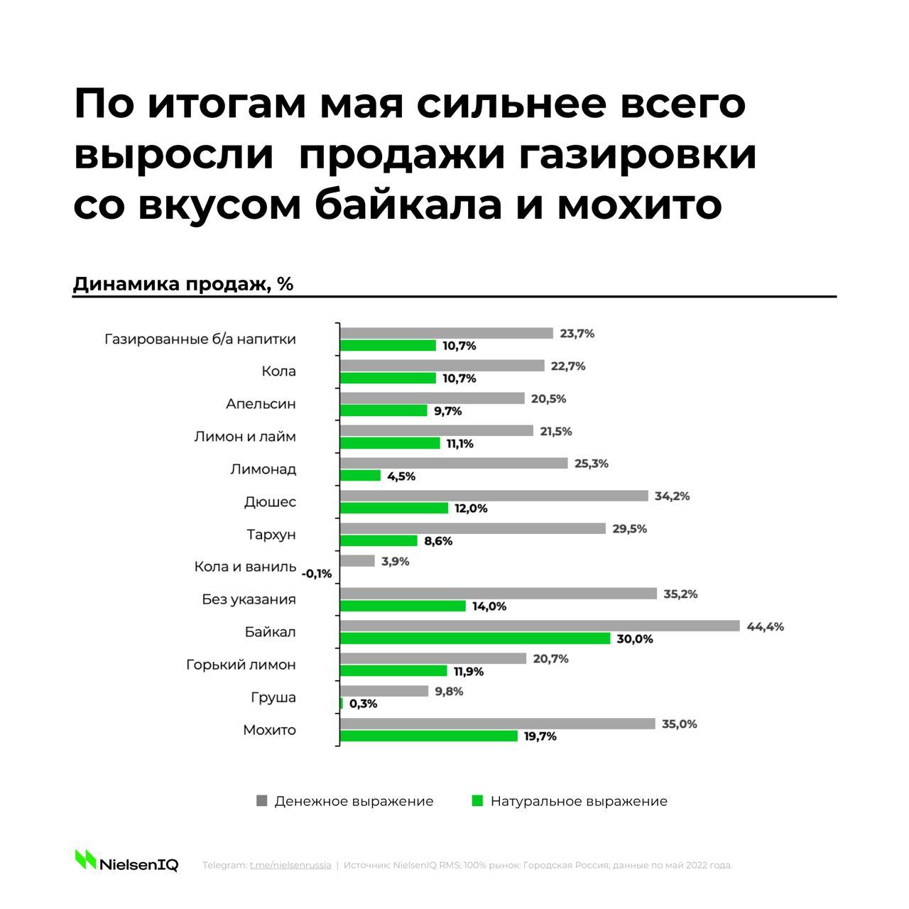 Доля продаж газированных напитков с отечественными вкусами продолжает расти.По итогам майских продаж сильнее всего увеличилась популярность байкала,говорится в исследовании NielsenIQ. Спрос на него вырос сразу на 30% внатуральном выражении. Также потребители делали выбор в пользу мохито (+19,7%)и дюшеса (+12%).