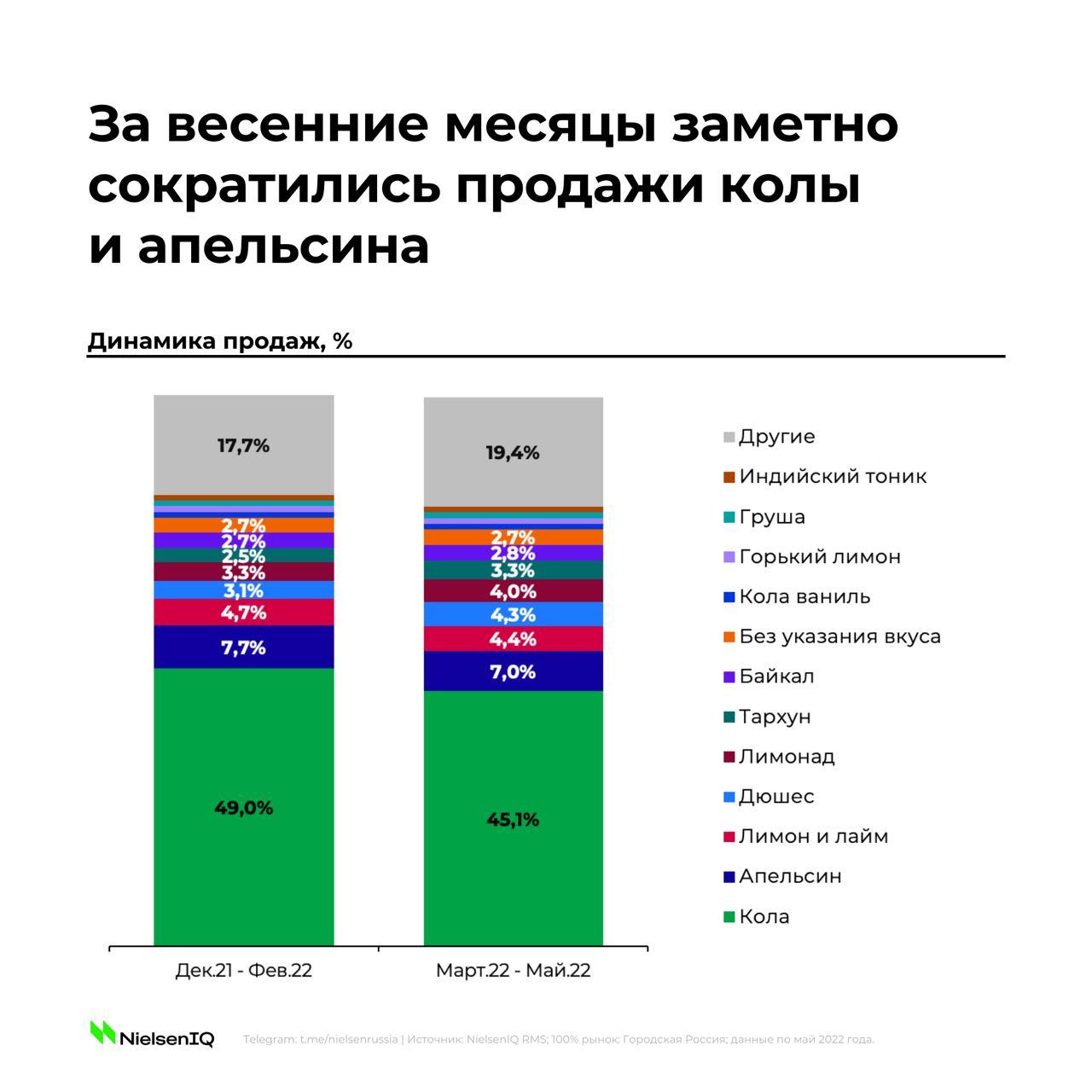 По сравнению с зимними месяцами доля продаж колы, которая является самойкрупной категорией среди безалкогольных газированных напитков, за март-майсократилась с 49% до 45,1%, а апельсина — с 7,7% до 7,0%.