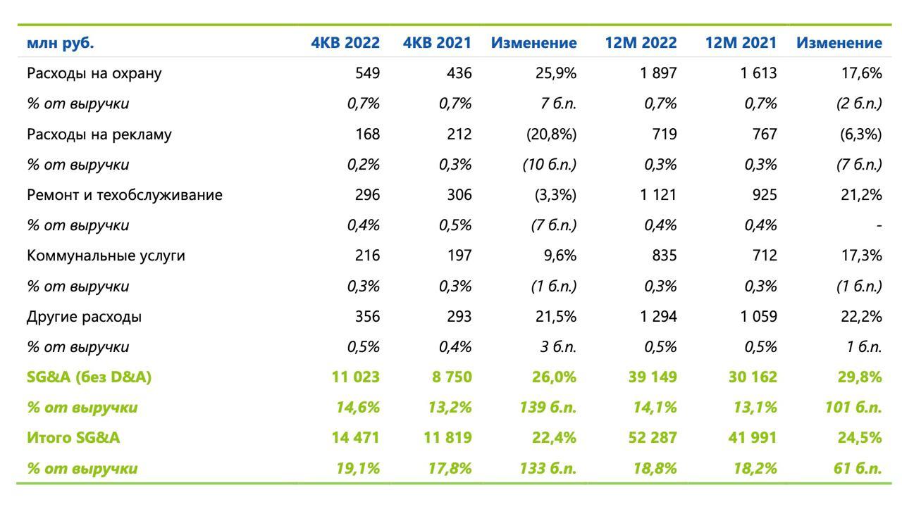Рекламные расходы сети сократились на 6,3% и достигли 719 млн руб. в 2022 г.Доля расходов на рекламу в выручке за год не изменилась и составила 0,3%. Вчетвертом квартале рекламные затраты уменьшились на 20,8% и составили 168 млнруб., доля расходов в выручке снизилась на 10 б. п. год к году, до 0,2%. Впресс-службе пояснили, что это связано с «оптимизацией затрат и положительнымэффектом операционного рычага».