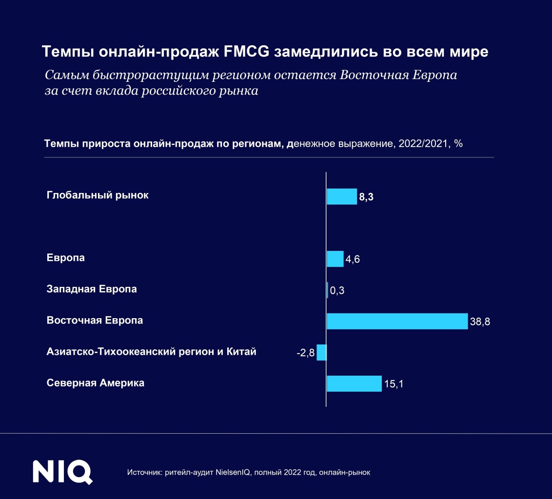 Константин Локтев, директор по работе с ретейлером NielsenIQ, отметил, чтона мировом рынке FMCG главным трендом электронной коммерции сейчас становитсязамедление продаж. Общая динамика онлайн-торговли снизилась вдвое — с 16,2% в2021 г. до 8,3% в 2022 г.