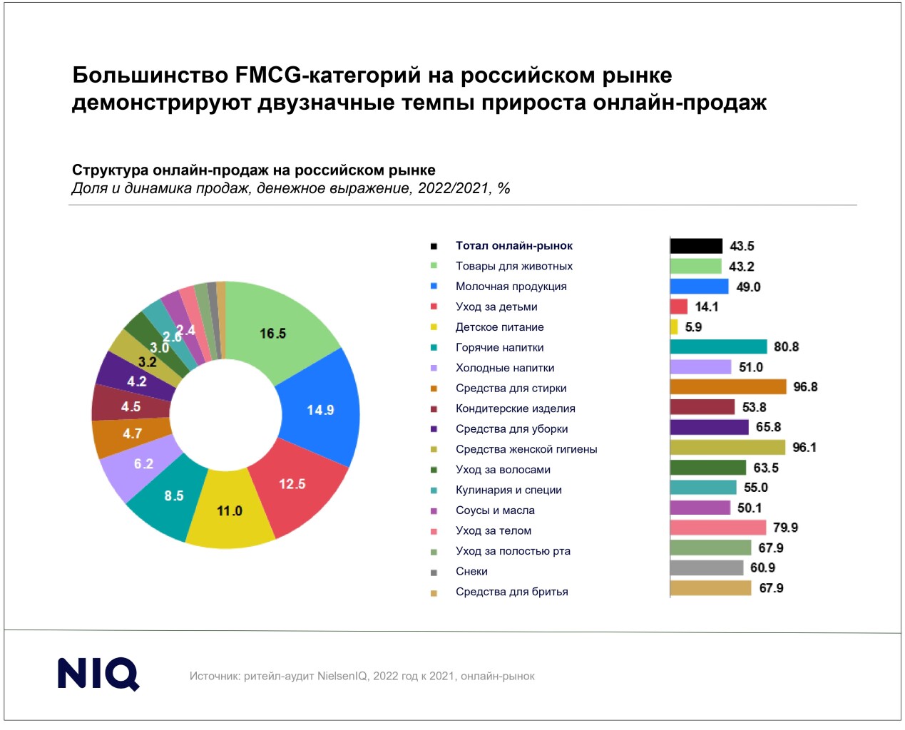 Россия возглавила топ-10 самых быстроразвивающихся онлайн-рынков товаровповседневного спроса по итогам 2022 г. Темпы продаж в канале электроннойторговли в РФ увеличились на 44%, в пять раз превысив средние значения наглобальном рынке. Доля онлайн-торговли в структуре FMCG-продаж в странедостигла 7,3%, согласно данным NielsenIQ.