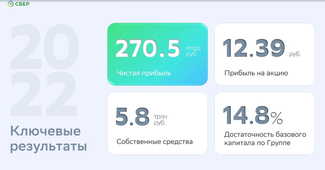 Чистая прибыль Сбербанка составила 270,5 млрд руб. за 2022 г., это на 78,3%меньше, чем в 2021 г. Об этомговорится в финансовом отчете банка по МСФО.