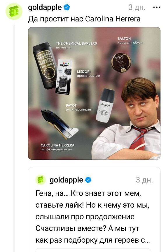 Сеть магазинов также публикует мемы и рекламирует собственныеакции: