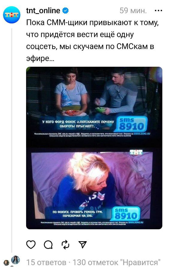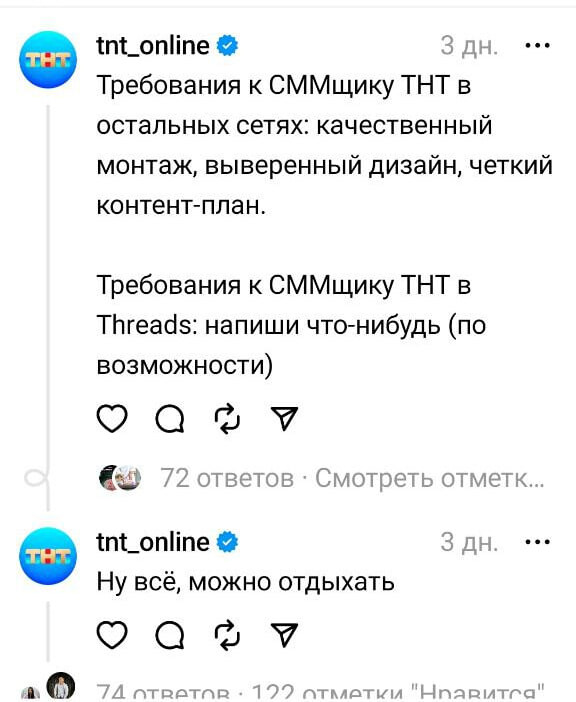 ТНТ шутит: «Пока эсэмэмщики привыкают к тому, что придется вести еще однусоцсеть, мы скучаем по эсэмэскам в эфире». Канал также опубликовал шуточныйсписок требований к эсэмэмщику ТНТ в Threads*.