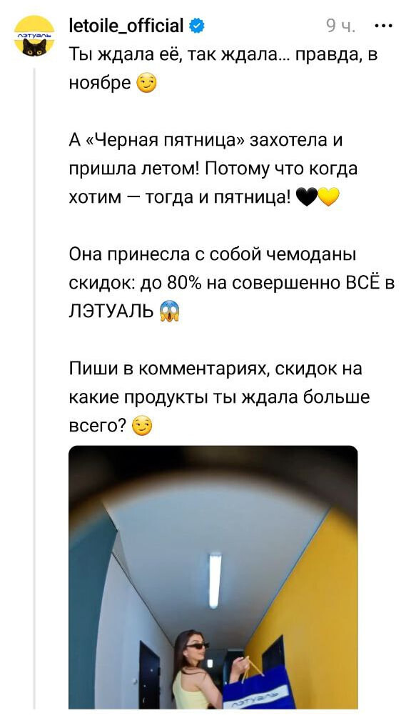 «Л'этуаль» запустил в аккаунте кампанию в честь «Черной пятницы» в июле.