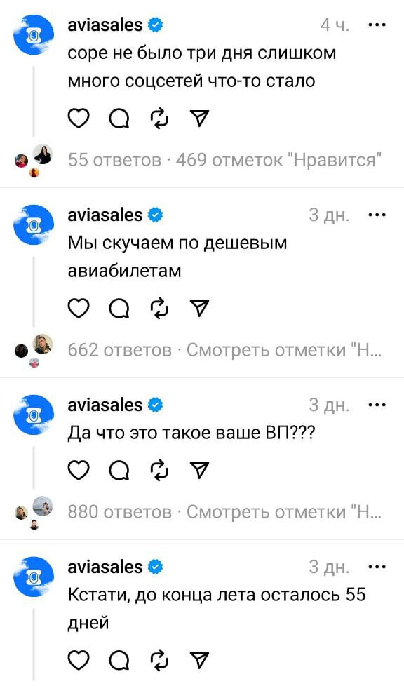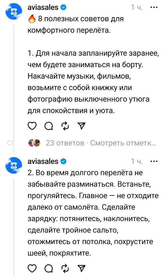 «Авиасейлс» публикует как познавательный контент, например «Восемь полезныхсоветов для комфортного перелета», так и смешные мини-«нитки» — «соре не былотри дня слишком много соцсетей что-то стало».
