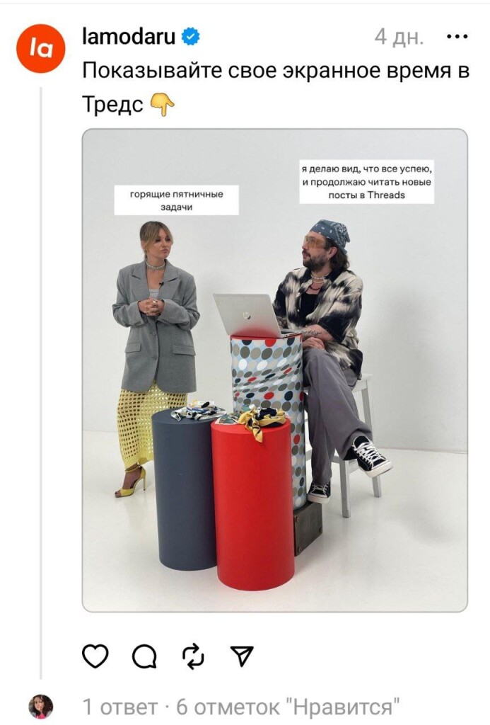 Ретейлер Lamoda набрал почти 5 тыс. подписчиков на новой платформе. АринаЕфремова, менеджер контента в социальных медиа Lamoda, считает, что у Threads*есть потенциал, так как соцсеть уже интегрирована в Instagram*, чтопозволяет охватывать аудиторию сразу на двух площадках, но при этом показыватьподписчикам разнообразный контент.
