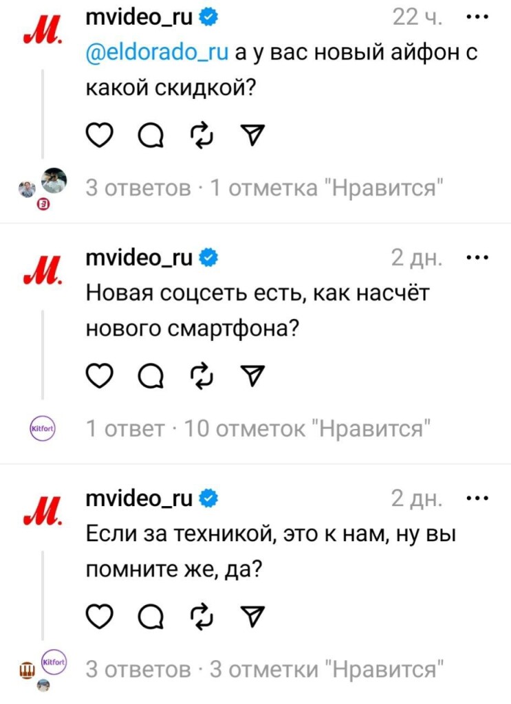 В пресс-службе «М.Видео-Эльдорадо» (у «Эльдорадо» 1 тыс.подписчиков, у «М.Видео» — 2 тыс.) рассказали, что завели аккаунт вThreads*, чтобы поддержать текущий тренд. Ретейлер также хочет с помощью новойплощадки быть с целевой аудиторией «на одной волне».
