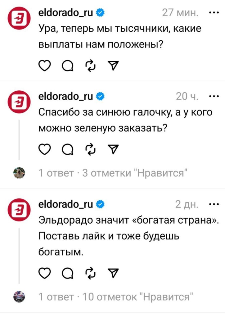 «М.Видео-Эльдорадо» делает посты наподобие твитов без картинокв формате шуток: «Новая соцсеть есть, как насчет нового смартфона?», «Спасибоза синюю галочку, а у кого можно зеленую заказать?».