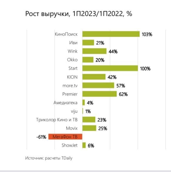 Лидером по увеличению выручки стал «Кинопоиск» — на 103% год к году. Навтором месте Start с приростом в 100%, далее идет Premier — на 62%. Начетвертом и пятом местах more.tv и Kion с результатами 57 и 42% соответственно.Наихудший результат у «МегаФон ТВ» — выручка онлайн-кинотеатра упала на61%.