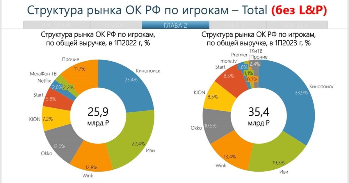 Первое место по доле в денежном выражении на рынке онлайн-кинотеатров такжезанял «Кинопоиск», который занимает 33,9%. На второй позиции «Иви» срезультатом в 19%, замыкает тройку лидеров Wink — 13,4%.