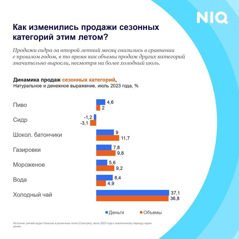 Натуральные продажи пива, шоколадных батончиков, газированных напитков,мороженого и воды увеличились на 2–10% в июле 2023 г. по сравнению саналогичным периодом прошлого года. Об этомговорится врезультатах исследования NielsenIQ.