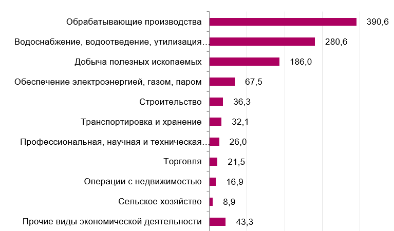 Среди отраслей экономики наибольшие экологические расходы понеслиобрабатывающие производства — 390,6 млрд руб., в частности, металлургия — 171,7млрд руб., химическая промышленность — 67,8 млрд руб., производители кокса инефтепродуктов — 63 млрд руб.