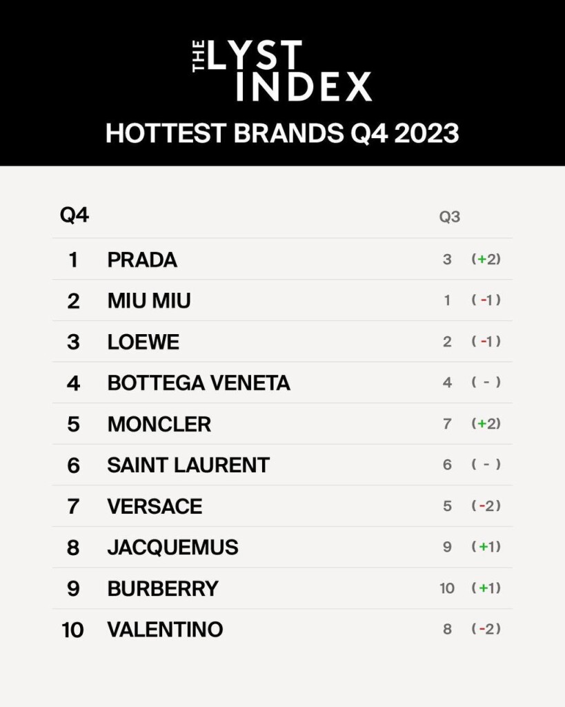 Компания Prada обогнала Miu Miu и Loewe в рейтинге самых популярных мировыхмодных брендов в четвертом квартале 2023 г. по версии фешен-платформыLyst. В топ-5 также вошли Bottega Veneta иMoncler.