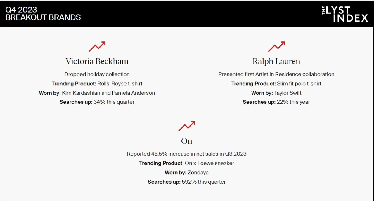 В категории «прорывов» среди брендов самые высокие результаты показалиVictoria Beckham, который выпустил футболку My dad had a Rolls-Royce («У моегопапы был Rolls-Royce»), On и Ralph Lauren.