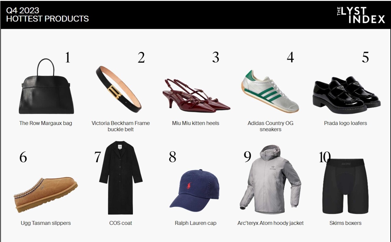 Самыми желанными товарами стали сумка Margaux bag The Row, ремень VictoriaBeckham, туфли с ремешками Miu Miu, кроссовки Adidas Country OG и лоферыPrada.