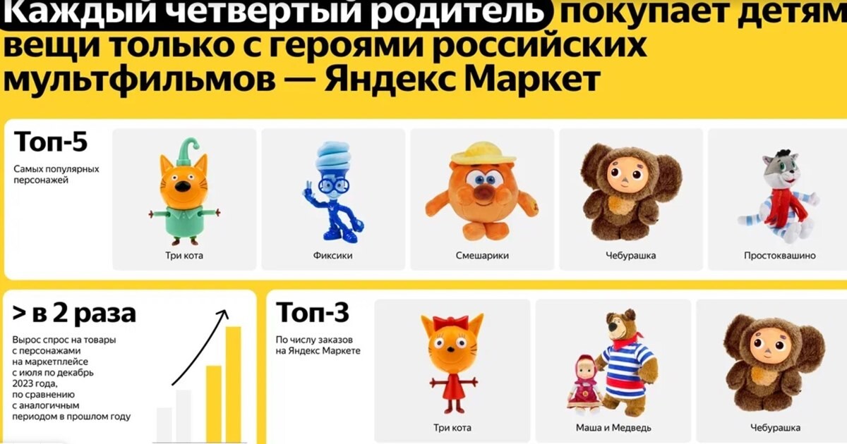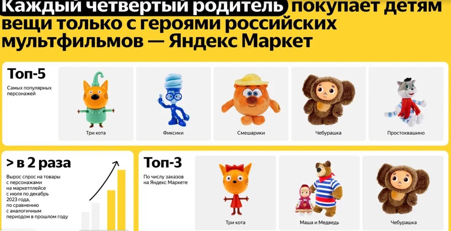 Самыми популярными героями мультфильмов были названы три кота изодноименного сериала (45%). В топ-5 также вошли «Фиксики», «Смешарики»,«Чебурашка» и «Простоквашино». По числу заказов в лидерах оказались «Три Кота»,«Маша и Медведь», «Чебурашка». При этом спрос на «Фиксиков» и «Смешариков»вырос более чем в два раза во второй половине 2023 г. по отношению каналогичному периоду 2022 г.