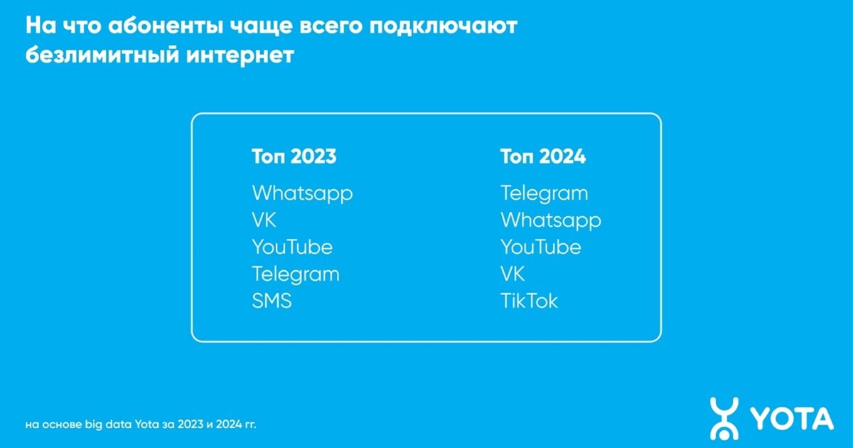 Топ самых востребованных онлайн-приложений в 2024 г. возглавил «Телеграм»,говорится в сообщении Yota, поступившем в AdIndex.