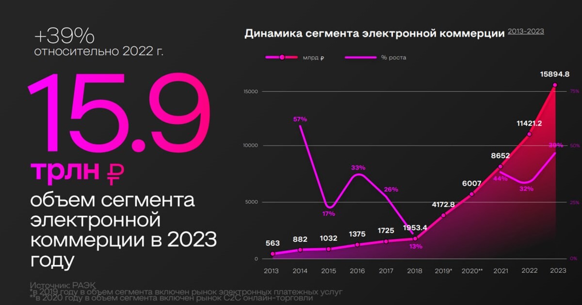 E-сom увеличился на 39% год к году и достиг 15,9 трлн руб. в 2023 г. На 35%вырос сегмент онлайн-ретейла и составил 533,8 млрд руб. Онлайн-тревел показалрост на 28% — до 532 млрд руб. Рынок электронных платежных услуг составил 4,3трлн руб. с ростом 42% год к году. C2C-торговля также выросла на 42% и достигла3,3 трлн руб.