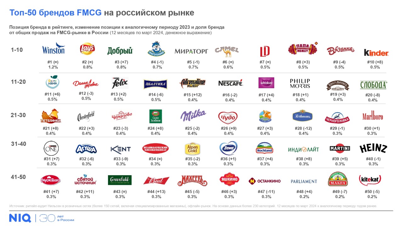Рейтинг был составлен по итогам 12 месяцев по март 2024 г. включительно.Лидерами остались бренды сигарет Winston от Japan Tobacco International ичипсов Lay’s (PepsiCo). Третья позиция теперь у напитка «Добрый» («Мултон»),который раньше занимал 10-ю строчку рейтинга.