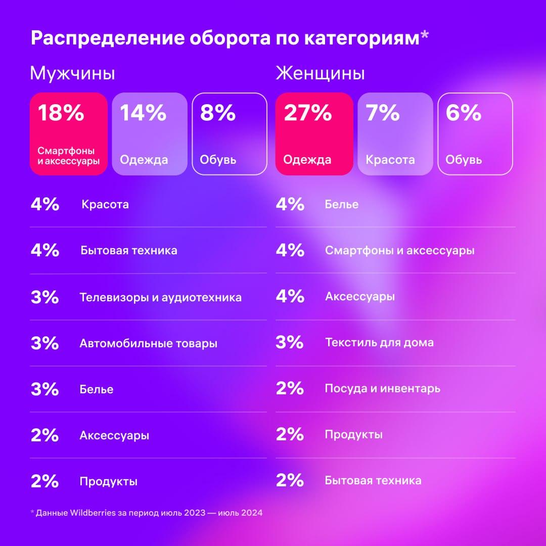 Что касается объемов торговли, то категории с самыми большими долями оборотау мужчин — это смартфоны (18% от общего объема продаж) и одежда (14%). Дляженщин это одежда — 27%. Кроме того, мужчины чаще работают с российскимипроизводителями — 38 против 29%.