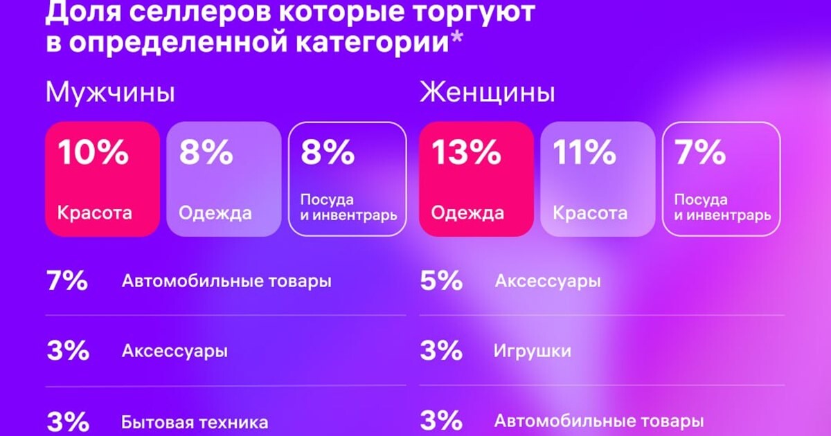 Женщины чаще продают одежду на маркетплейсе — 13% от общего числапредпринимательниц. На втором месте — товары для ухода за собой (11%). Мужчинычаще выбирают категорию «красота» (10%), одеждой занимаются 8%, на третьемместе у обоих представителей бизнеса расположена посуда.
