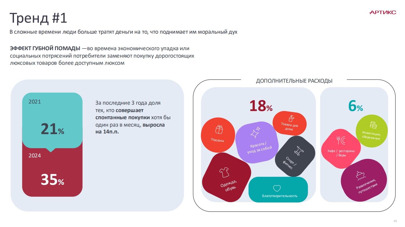 Кроме того, 43% миллениалов и 35% зумеров предпочитают не откладывать деньгив долгосрочной перспективе, а потратить на краткосрочное удовольствие. В целомза последние три года доля тех, кто совершает спонтанные покупки хотя бы одинраз в месяц, выросла с 21 до 35%.