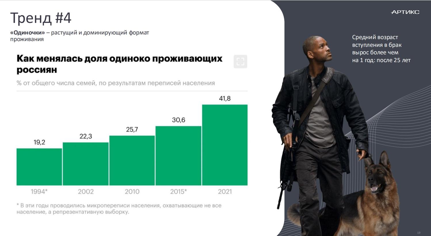 Четвертый тренд — рост количества одиноких россиян. На момент 2021 г. долятаких потребителей составляла 41,8% от общего количества семей.