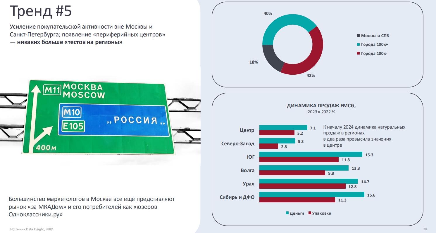 Еще одна тенденция — усиление покупательской активности вне Москвы иСанкт-Петербурга. В России появляются «периферийные центры». К началу 2024 г.динамика натуральных продаж в регионах в два раза превысила значения вцентральных районах.