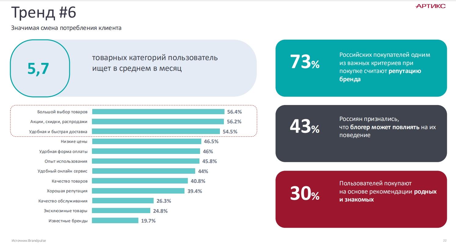 Последний тренд — значимая смена потребления клиента. Пользователь в среднемищет 5,7 товарной категории в месяц. При этом 73% российских покупателейсчитают репутацию бренда одним из важных критериев при выборе товара. Почтитреть покупают на основе рекомендаций родных и знакомых, а 43% сообщили, что наих выбор может повлиять блогер.