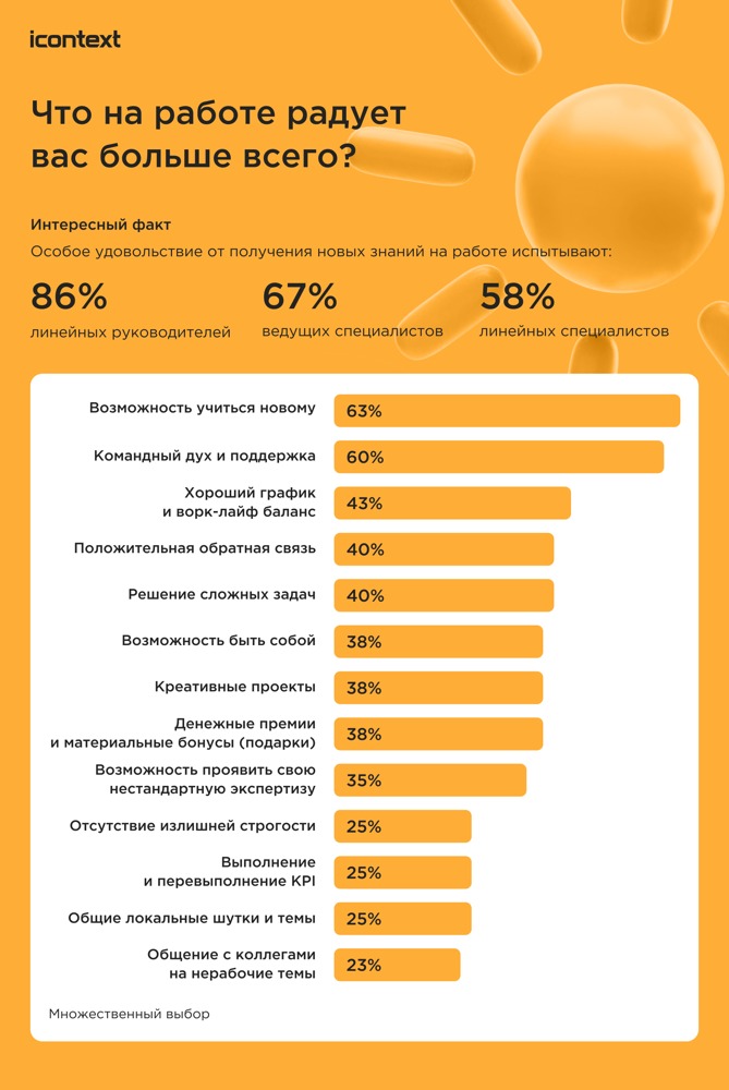 Одинаково радуют опрошенных положительная обратная связь и решение сложныхзадач (по 40%). Креативные проекты и денежные премии улучшают настроение 38%респондентов. Еще четверти маркетологов удовольствие приносят отсутствиеизлишней строгости, выполнение и перевыполнение KPI. Общее с коллегами нанерабочие темы ценят 23%.