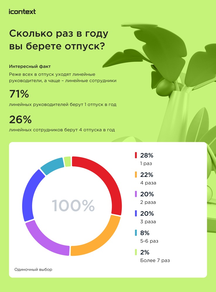 Что касается отдыха, то отпуск один раз в год берут 28% респондентов. Четырераза в год так делают 22%, каждый пятый отдыхает дважды в год. Реже всех берутперерыв от работы линейные руководители (71%), а чаще — линейные сотрудники(26%).