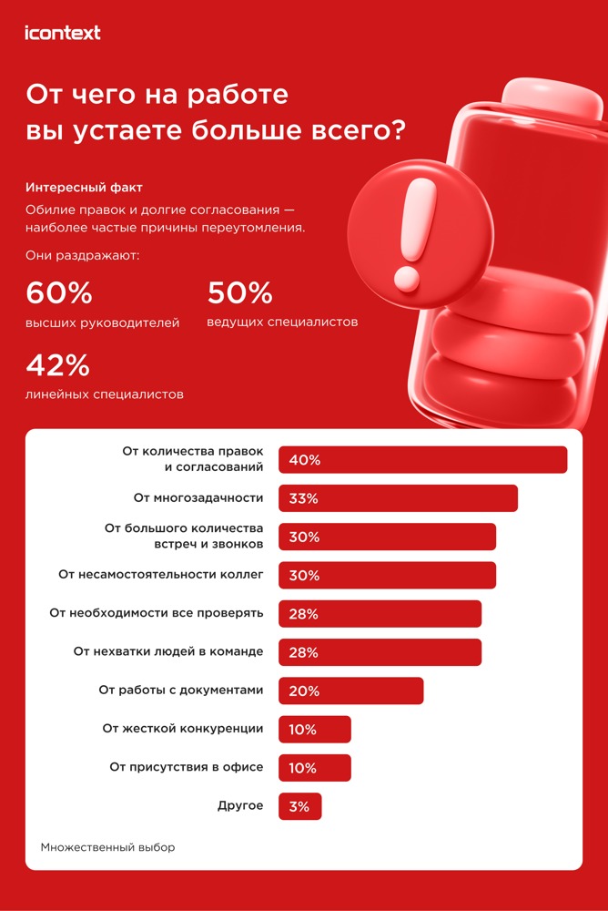 Треть респондентов устает от многозадачности. Бесконечные встречи и звонки,а также несамостоятельность коллег раздражают 30% участников опроса. По 28%ответов пришлось на такие позиции, как необходимость все проверять и недостатоклюдей в команде (по 28%).