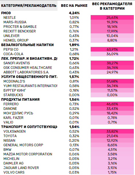 Наибольшую роль в сокращении рекламных бюджетов играют компаниисегмента FMCG, их уход лишит рынка 4,2% (при пессимистичном сценарии 4,3%). Навтором месте категория безалкогольных напитков, где лидируют американскиеPepsiCo и Coca-Cola, здесь минимальные и максимальные потери составят 1,9 и2,3% соответственно. Замыкает ТОП-3 по влиянию на объем рынка категориялекарств и БАДов - по оптимистичной оценке прекращение их деятельности уменьшитрынок на 1,9%, а по пессимистичному прогнозу их доля в сокращении рекламныхбюджетов составит целых 5,5%, что выведет их на первое место по влиянию нарынок.