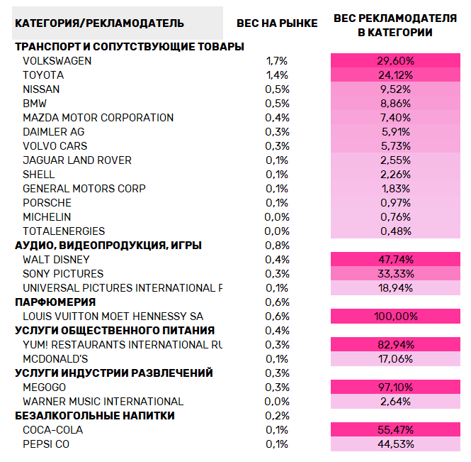 «Если, условно говоря, в 2015-2016 годах абсолютным лидером среди товарныхкатегории были автомобили (порядка 30-35%), то в 2021 году доля категориисоставила уже около 20%. А по итогам первого квартала 2022 года, и вовсе —порядка 8%. Также с нами по-прежнему продолжают сотрудничать компании изразличных товарных категорий. А самые устойчивые к кризису из них те, у когодоля импортного сырья и компонентов продукции стремится или равна нулю,компании с участием государственного капитала, а также банки. За последниймесяц их доля в обороте «Европейской медиагруппы» составила свыше 30%. Есть ещёклиенты из категории фармацевтики, которые даже несколько увеличили бюджет в2022-ом.