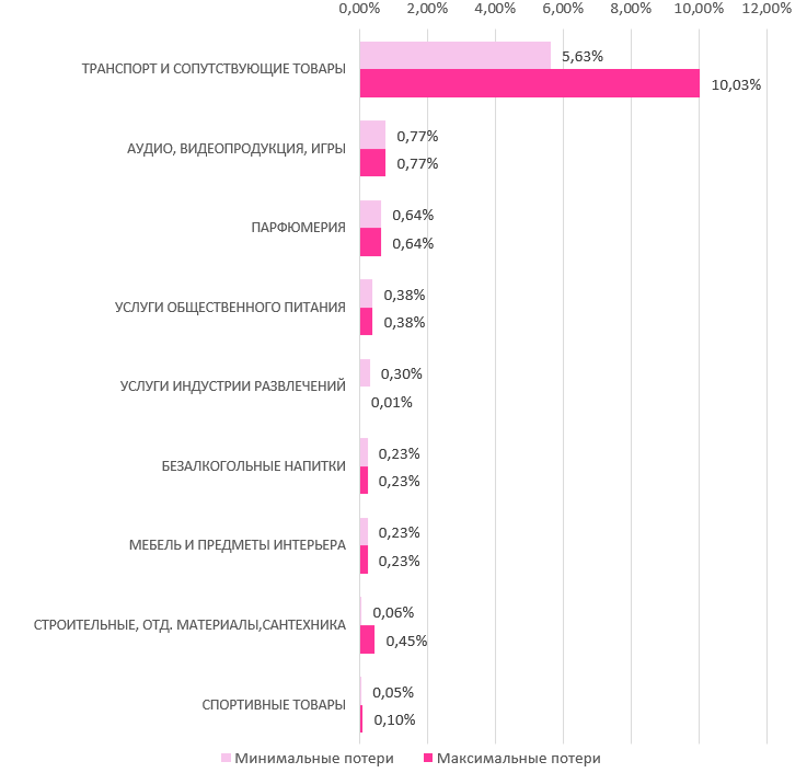 Самая значимая категория рекламодателей на радио - автопроизводители. Приоптимистичном сценарии потери от ухода с российского рынка компаний этогосегмента рекламные доходы уменьшатся на 5,6%, при пессимистичном - на 10%.Основные драйверы этого сегмента на рекламном рынке - компании Volkswagen (доля29,6%), Toyota* (24,1%) и Nissan (9,5%). Кроме них, значимое влияние, сдолей в радиобюджетах категории более 1%, окажут бренды BMW, Mazda,Daimler, Volvo, Jaguar и General Motors. Активные рекламодатели на радио изостальных категорий при уходе не окажут значительного влияния на сокращениерекламных доходов, т.к. их доля даже при максимально возможных потерях недостигнет 1%.Минимальные имаксимальные возможные потери бюджетов на радио. Вклад категорий