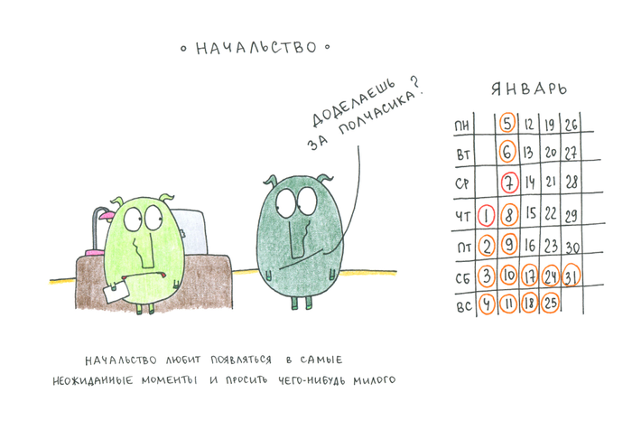 В календаре нашли свое отражение характерные ситуации из офисной жизни. Чего стоит один тезис «Начальство любит появляться в самые неожиданные моменты и просить чего-нибудь милого»!