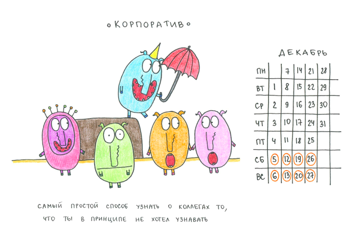 А какая работа без корпоративов, которые – «самый простой способ узнать о коллегах то, что ты в принципе не хотел узнавать»!