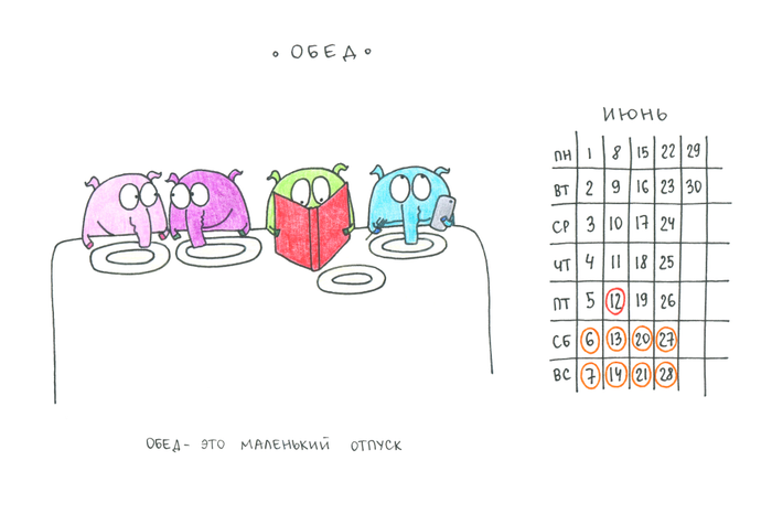 Эти и многие другие ситуации, с которыми каждый день сталкиваются офисные работники, в календаре обыгрывают симпатичные звери. Они обедают в компании коллег: