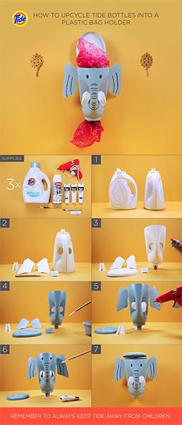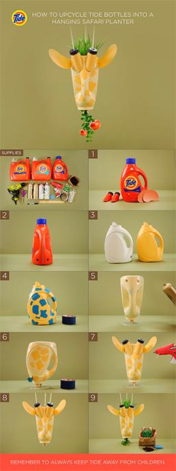 На странице в социальной сети Pinterest SMM-щики Tide не только рассказывают, как вывести пятно с помощью продукции бренда, или привести свою ванную комнату в порядок, но и показывают, как во второй раз использовать упаковку. Например, вы можете узнать, как сделать из бутылки слона, жирафа, поросенка или даже корзинку.