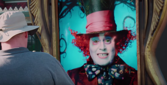 Популярный актер, исполняющий роль Безумного Шляпника в новом фильме «Алиса в Зазеркалье» от продюсера Тима Бертона, оживил билборд в парке развлечений, чем напугал прохожих