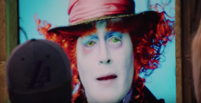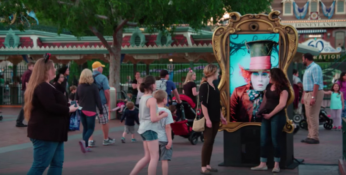 В рамках промо продолжения истории про приключения Алисы Льюиса Кэррола, студия Disney запустила необычную кампанию при участии Джонни Деппа. В одном из парков Диснейленд, располагающемся в Анахайме (Калифорния), на входе установили на первый взгляд обычный digital-билборд с красочной афишей фильма «Алиса в Зазеркалье», на которой был изображен Безумный Шляпник. Но оказалось, что не все так просто. В один прекрасный момент персонаж Джонни Деппа оживал, начинал моргать и говорить с прохожими. В реальном времени посетители парка развлечений могли пообщаться с любимым персонажем, который смешил их, развлекал заданиями и даже чихал мыльными пузырями.