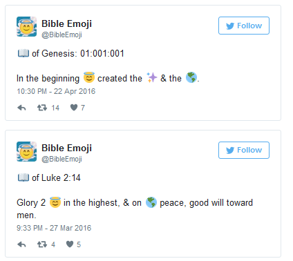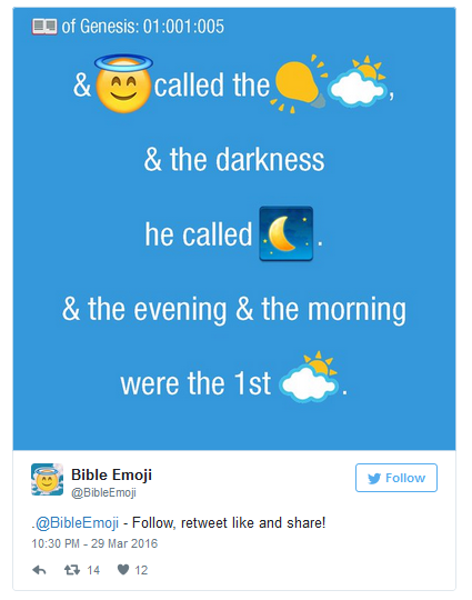 Неизвестный автор описал свое творение как «весьма интересный способ поделиться Евангелием» и интерпретировал все 66 книг Библии короля Якова с помощью поддерживаемых стандартом Unicode emoji и популярных в сети сокращений.