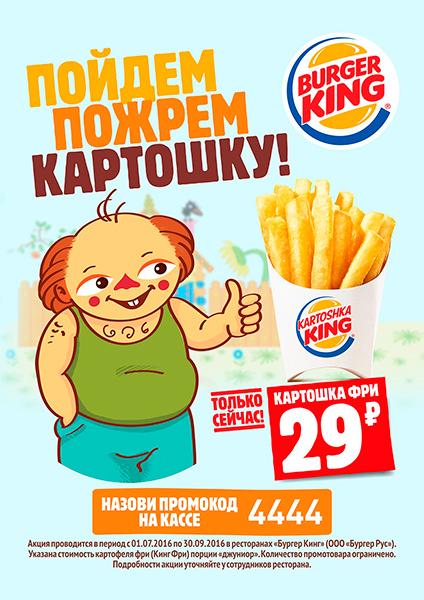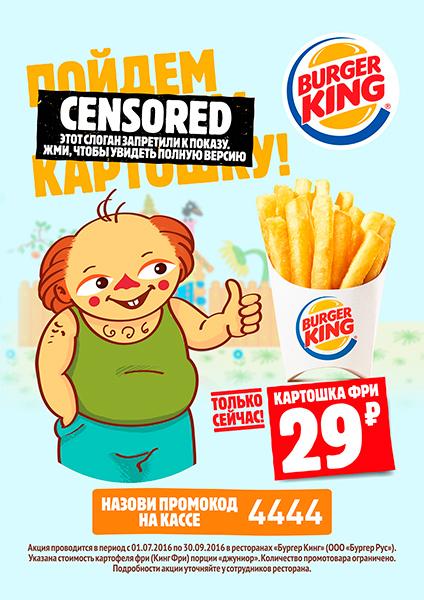 Как сообщили в компании, сегодня утром пассажиры метро могли видеть рекламу новой акции «Картофель Фри за 29 рублей», где часть макета перекрыта надписью «Цензура». При этом в официальных пабликах «Бургер Кинг» был выложен оригинальный макет «Пойдём пожрем картошку за 29 рублей!»