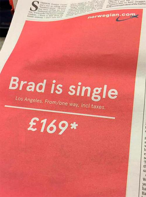 Норвежский авиаперевозчик разместил рекламу билетов на собственные рейсы в Лос-Анджелес со слоганом: «Брэд свободен!». Объявление появилось в газетах и интернете спустя всего несколько дней после того, как СМИ сообщили о разводе самой красивой пары Голливуда.