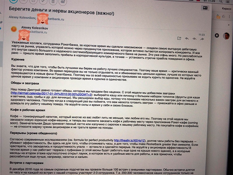 В остроумном письме, которое опубликовал в Facebook маркетолог Рокетбанка Кирилл Родин, компания обыгрывает приказ Олега Тинькова «не воровать время у него и у акционеров»