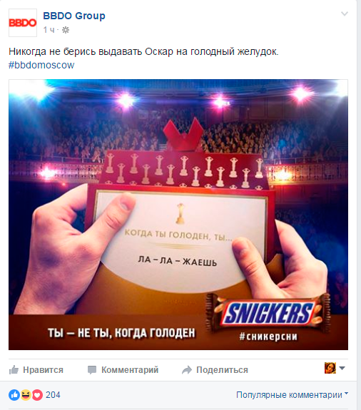 Название ошибочно объявленного победителем фильма Ла-Ла Ленд креативщики использовали в рекламе Snickers. Баннер опубликован на странице агентства в Facebook в сопровождении привычного слогана бренда «Ты – не ты, когда голоден».