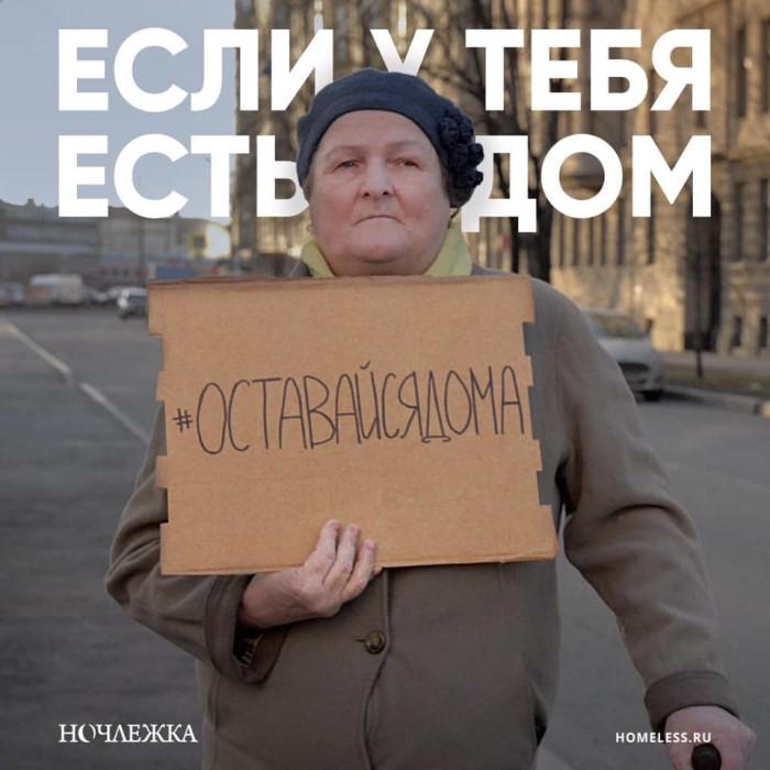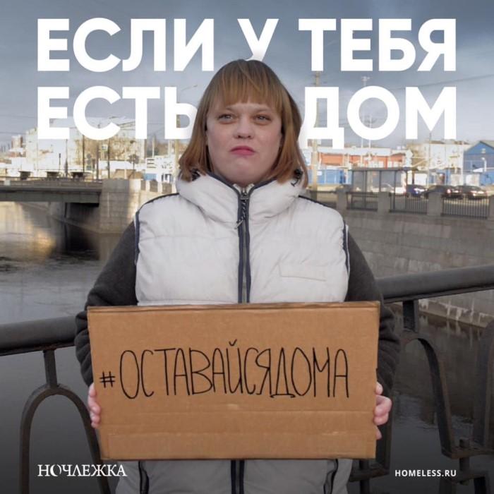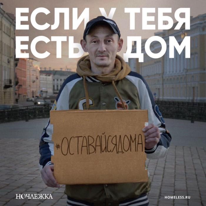 Благотворительная организация «Ночлежка», помогающая бездомным людям, запустила социальную кампанию с призывом оставаться дома — к тем, у кого этот дом есть.